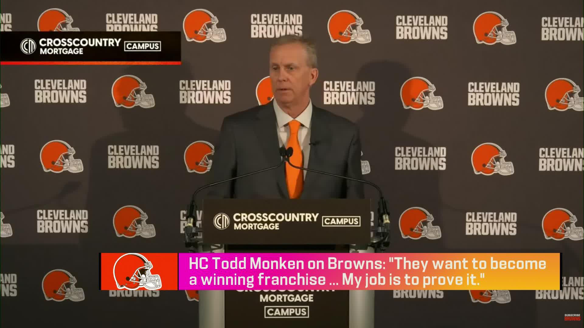 Cleveland Browns head coach Todd Monken talks quarterback at introductory press conference.